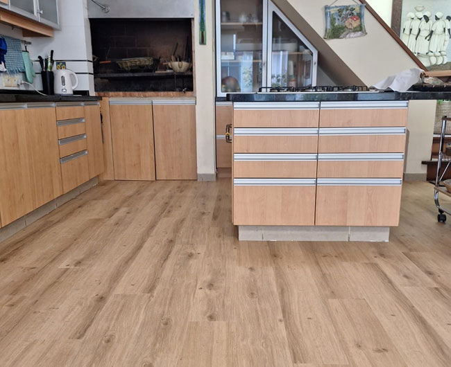LVT: compuesto por una capa superior de vinilo de 0.7 mm que le proporciona un excelente rendimiento y una estructura inferior de PVC de gran durabilidad y fortaleza. Impermeable y resistente a los golpes, posee una alta estabilidad dimensional.